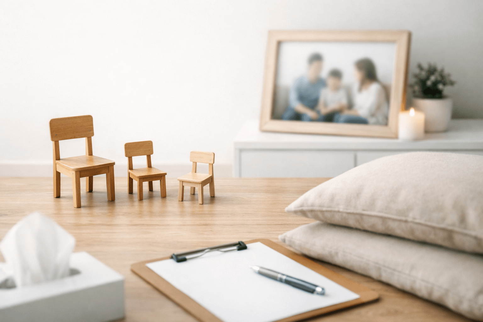ではさっそくいきますが、セラピーで親子関係を扱う時って、まずクライアントさんの前にいくつかの空の椅子を置いて、「子供の頃の家族の風景」を再現するんですね。