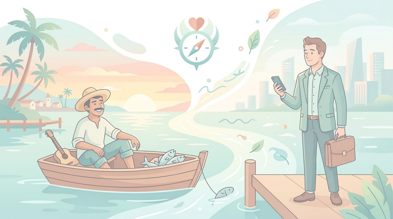 返答に驚いたアメリカ人は「もっと長い時間、漁をして、いっぱい捕まえればいいじゃないか」と提案すると、漁師は「なんでそんな必要があるのさ。これで十分食べていけるよ」と答えた。